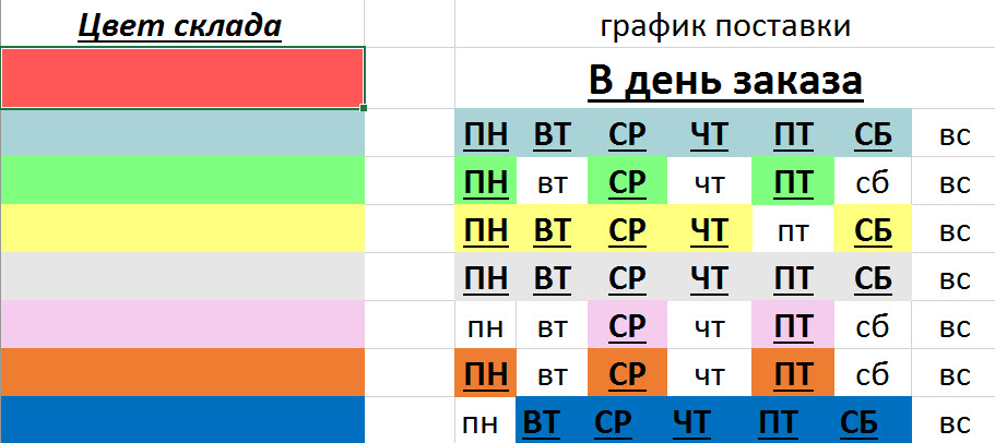 Пример: При заказе в рабочее время во вторник товара со сроком поставки 2-4 дня у поставщика серого цвета получить его на складе в г. Миллерово можно будет либо в субботу, либо в понедельник.